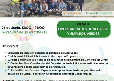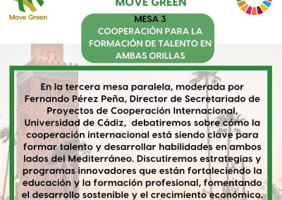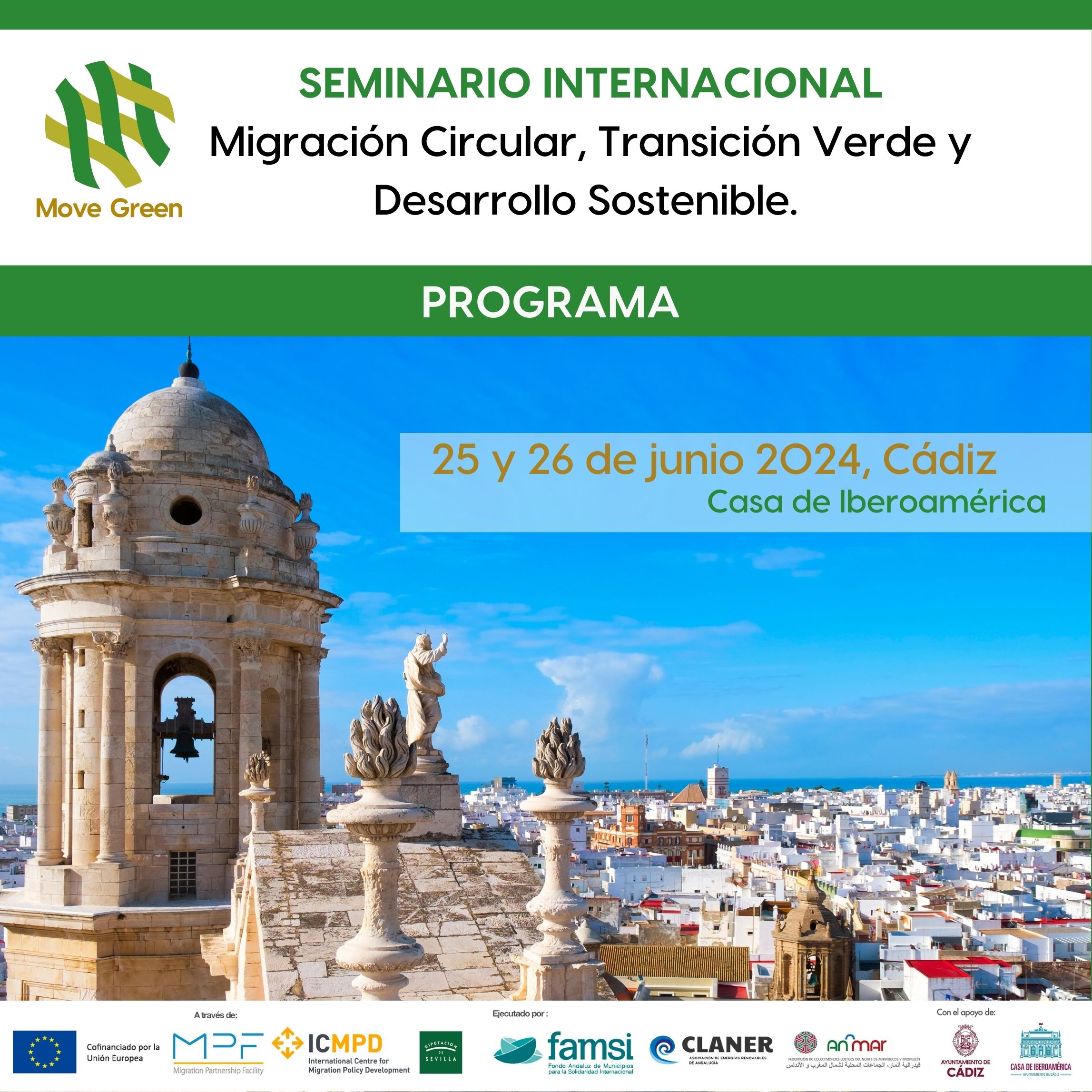 El proyecto MOVE GREEN bajo el lema «(E)codesarrollo para la innovación y el empleo en el sector de economía verde y circular entre Andalucía y Marruecos», promueve un modelo de migración laboral circular en el sector de las energías renovables. Es una alianza institucional Andalucía – España – Marruecos liderada por FAMSI (Fondo Andaluz de Municipios para la Solidaridad Internacional) y CLANER (Asociación de Energías Renovables de Andalucía), junto a la Federación AN^MAR de colectividades locales del Norte de Marruecos y Andalucía, y la cofinanciación de la Unión Europea a través del Migration Partnership Facility, que gestiona el International Centre for Migration Policy Development (ICMPD), junto con entidades de ambos países.