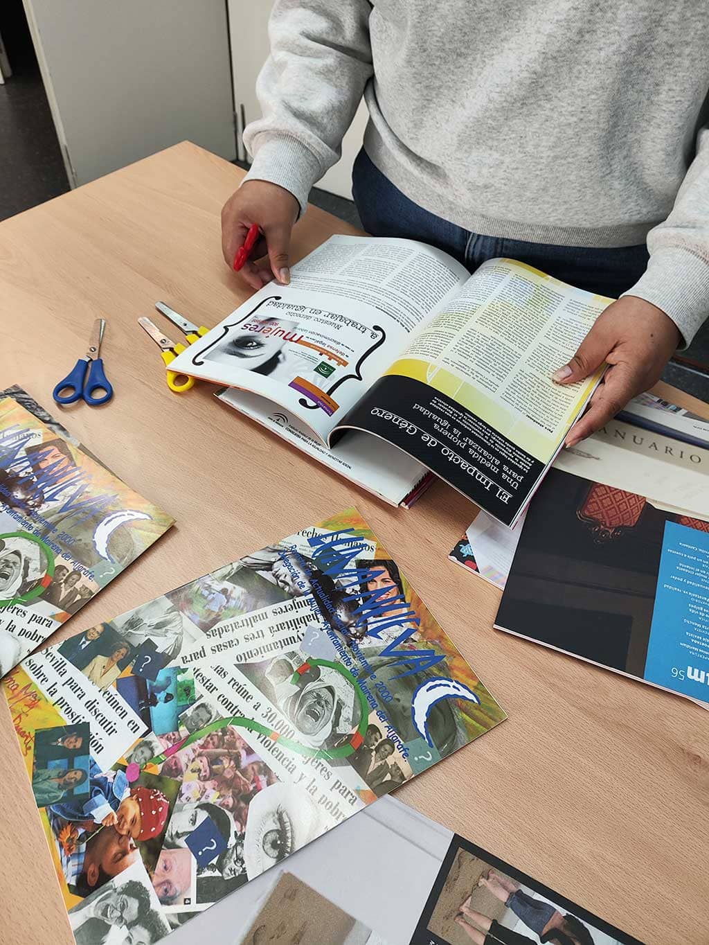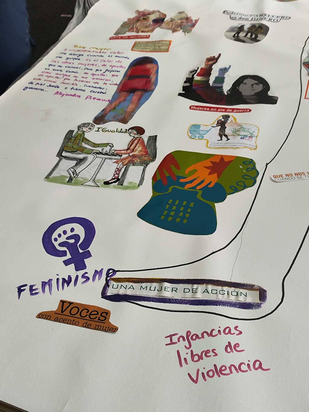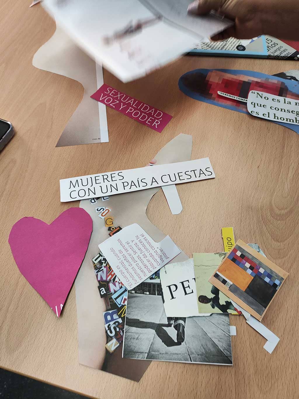 Durante las sesiones las mujeres crearon colectivamente un mural sobre las violencias machistas que las atraviesan en sus vidas y sus cuerpos, utilizando la técnica del collage y otros materiales pictóricos.
