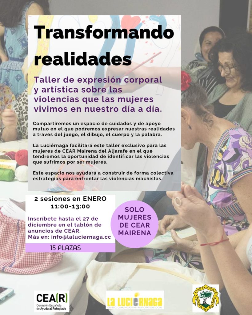 Taller dirigido a mujeres refugiadas, usuarias de CEAR en el Centro de Mairena del Aljarafe. En el taller se utilizaron técnicas de Arteterapia y Teatro Social, con el objetivo de identificar las violencias machistas que atraviesan las vidas y cuerpos de la mujeres y buscar estrategias colectivas para enfrentarlas. Compartimos un espacio de cuidados y de apoyo mutuo en el que pudimos expresar nuestras realidades a través del juego, el dibujo, el cuerpo y la palabra.